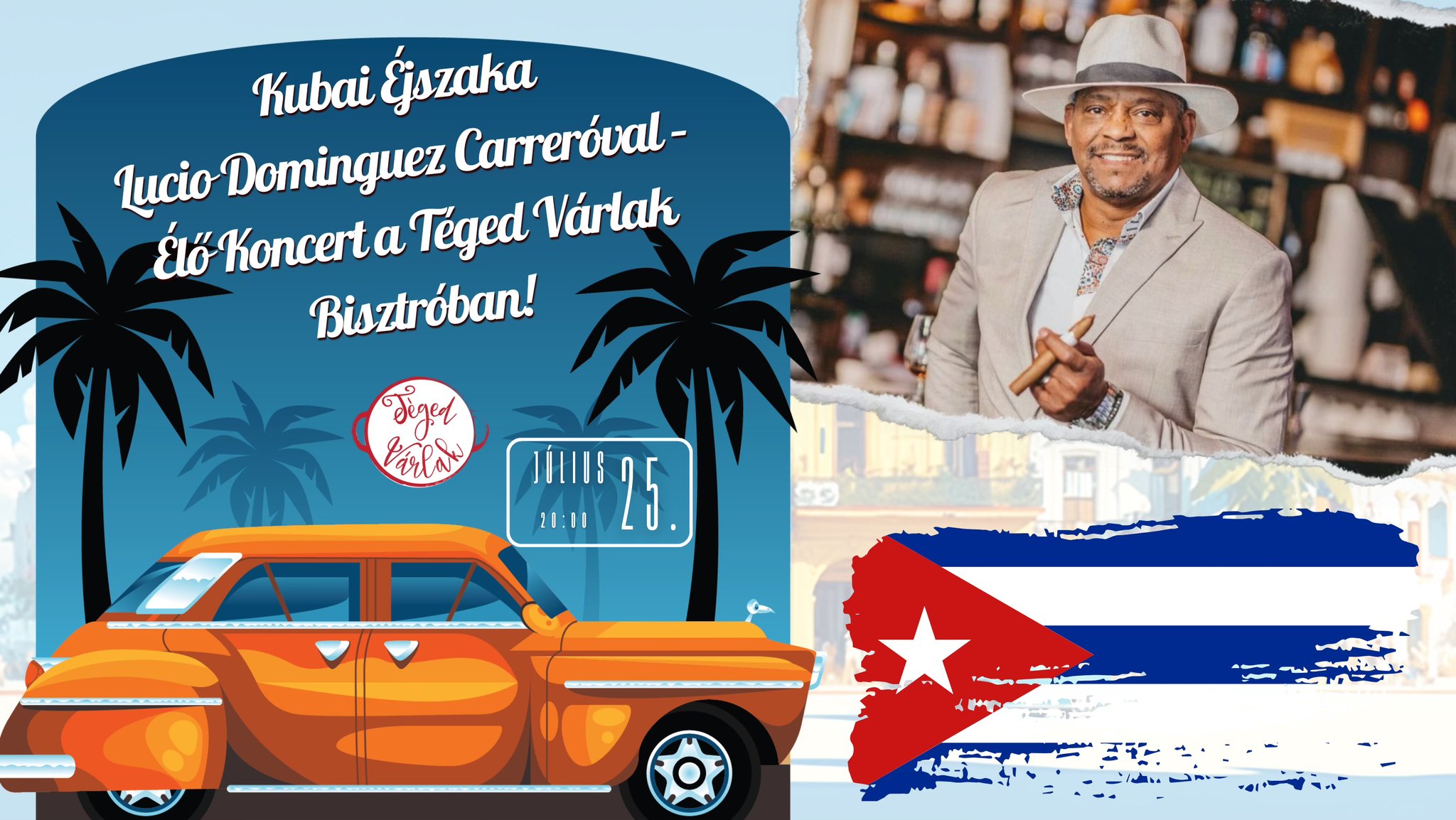 A nyár legforróbb estéje Téged vár! Július 25-én 20:00-tól Lucio Dominguez Carrero, a kubai zene karizmatikus énekese és zenésze elhozza Havanna szívét egészen hozzánk – a Téged Várlak Bisztróba!