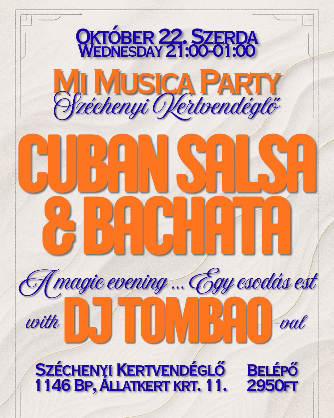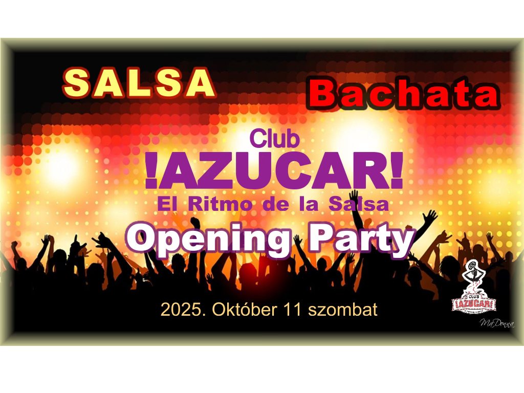 2025.10.11 -én szombaton szeretettel várjuk a salsa, bachata és cha-cha-cha táncok kedvelőit 21:00-01:30-ig tartandó bulira! Zene: Azucar (70% Salsa, 30% Bachata) Részletes információk: https://www.facebook.com/events/1337840631277332