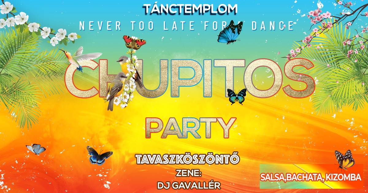 CHUPITOS TAVASZKÖSZÖNTŐ PARTY – salsa, bachata, kizomba party 3 teremben, kellemes vasárnap esti időtöltés barátokkal, zenével, sokféle tánccal….! Részletes információk: https://www.facebook.com/events/1249387903302160