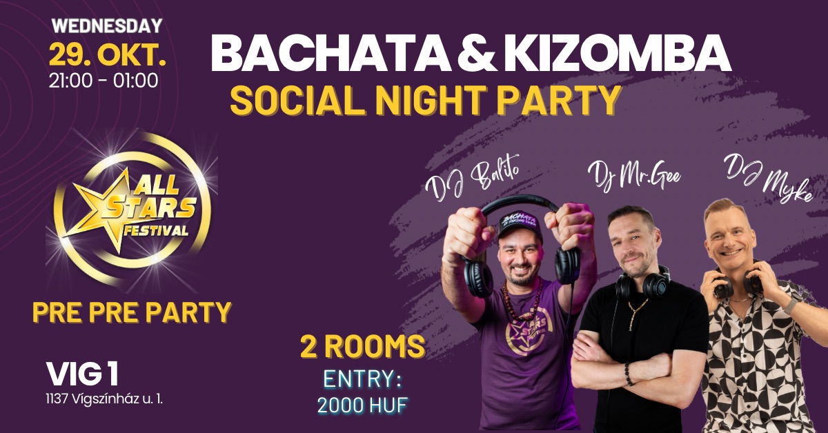 Várunk szeretettel Benneteket Október 29-én egy különleges, 2 termes bulira, ahol a Bachata mellett a Kizomba is helyet kap! P⋆⋆✮♪♫♫♪✮⋆⋆ Az All Stars Pre-Pre Party idén a Social Night keretein belül valósul meg. Részletes információk: https://www.facebook.com/events/716170868149989