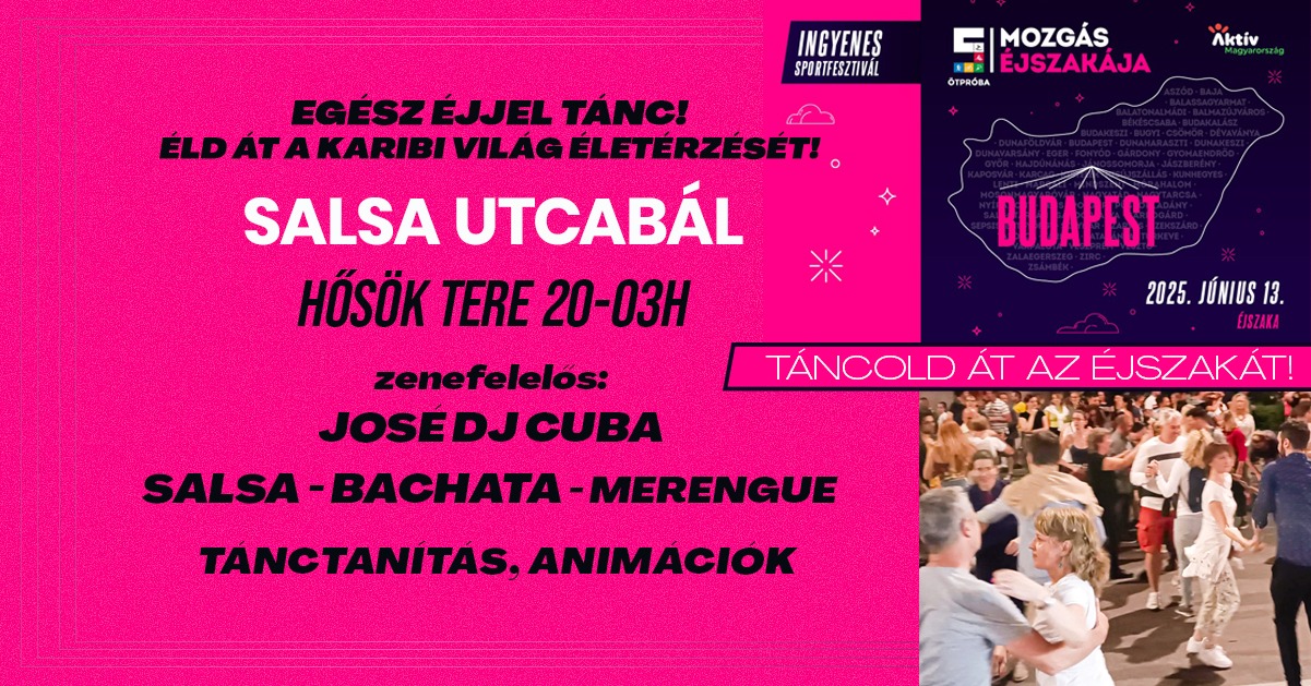 Hősök tere Hősök tere, Budapest, MagyarországIdén is megrendezésre kerül a Mozgás Éjszakája, ahonnan nem hiányozhatnak a karibi táncok (Kuba, Dominika) sem!Június 13.-én péntek este 20 órától másnap hajnal 03-ig szól a SALSA, BACHATA, MERENGUE! Egész éjjel utcabál! Éld át a latin világ életérzését!Ha már tudsz, gyere és táncolj, ha még nem tudsz, gyere és próbáld ki ezt az életérzést, ezeket […]
